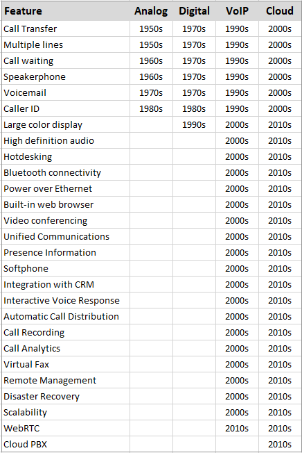 Arranged in chronological order, the table below showcases the introduction of key telephony features across analog, digital, VoIP, and Cloud technologies, emphasizing the unique capabilities brought forth by VoIP and Cloud technology. This structured timeline provides a comprehensive historical perspective on when these features first emerged, highlighting the swift evolution of VoIP technologies.